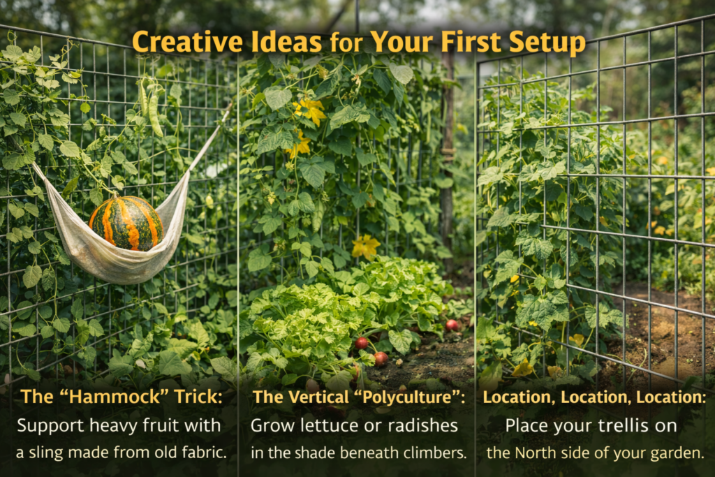 The Vertical “Polyculture”: You can actually grow two things in one spot. Plant your tall climbers on the trellis, and then plant lettuce or radishes in the “footprint” at the base. The trellis provides shade that keeps your lettuce from getting too hot and turning bitter.